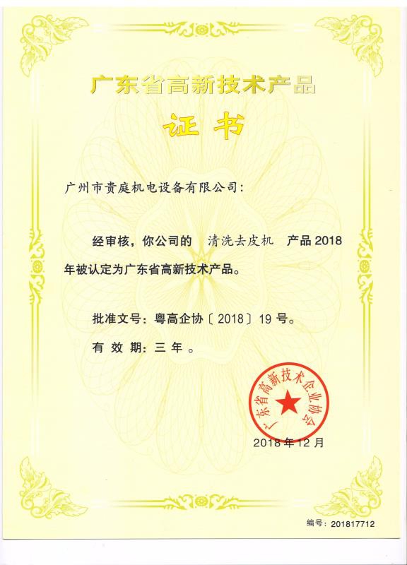 机电设备有限公司研发的 清洗去皮机 被认定为广东省高新技术产品!
