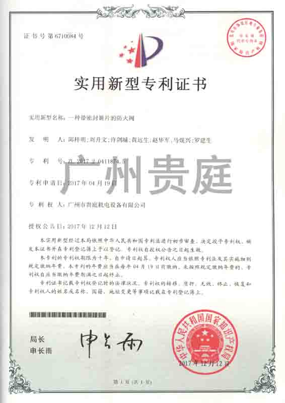 一种带密封簧片的防火阀是广州市贵庭机电设备有限公司自主开发、研制生产的专利产品